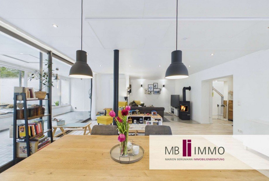 Im Eingangsbereich fällt gleich die helle Holztreppe auf, die ins Obergeschoss zu den Schlafräumen führt. Am Ende der Diele links geht es in den großzügigen Wohnbereich im Erdgeschoss. Herzstück ist das große Wohn-Esszimmer mit Verbindung zur modern ausgestatteten Küche und zum großen Wintergarten mit direktem Zugang in den Garten. Zwei große Terrassen stehen zur Verfügung. Eine ist großzügig überdacht und auch an regnerischen Tagen gut nutzbar. Im Erdgeschoss befindet sich ein gepflegtes Duschbad mit Tageslicht.